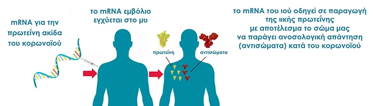 Όταν το τμήμα του ιικού mRNA εισέρχεται στο ανθρώπινο σώμα, “διαβάζεται” από τα κύτταρα και τους δίνει οδηγία να χτίσουν μία ορισμένη πρωτεΐνη του ιού.