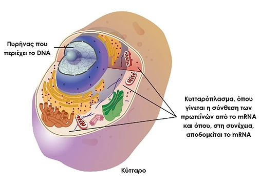 Το DNA του ανθρώπου βρίσκεται στον πυρήνα των κυττάρων μας. Το mRNA βρίσκεται στο κυτταρόπλασμα, όπου δίνει οδηγίες για την παραγωγή των πρωτεïνών και, στη συνέχεια, αποδομείται.