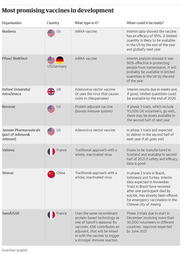 Οι εταιρείες Pfizer-BioNTech και Moderna έχουν πλέον ανακοινώσει δεδομένα αποτελεσματικότητας βάσει 170 και 196 κρουσμάτων αντίστοιχα, ενώ οι παρενέργειες καταγράφηκαν για τουλάχιστον δύο μήνες μετά την ολοκλήρωση του εμβολιαστικού σχήματος σε περισσότερους από τους μισούς συμμετέχοντες.