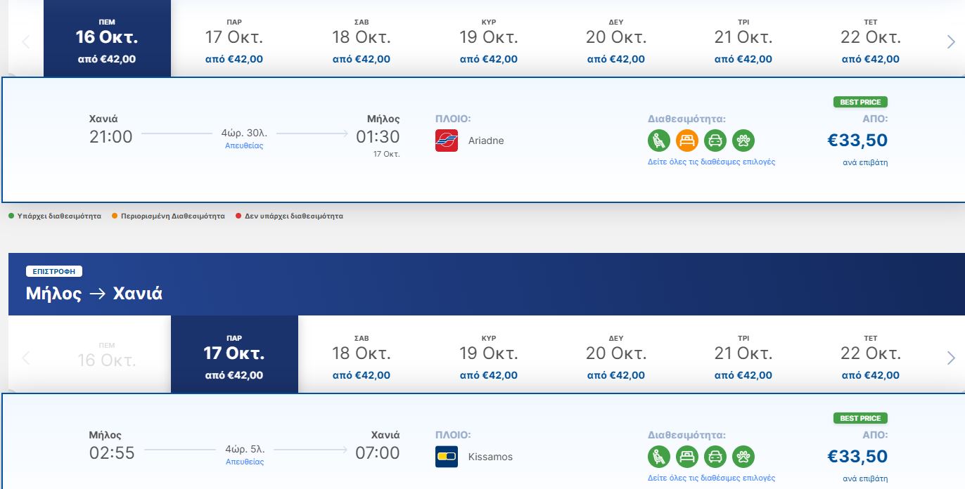 Από Μήλο για Χανιά το πλοίο θα φεύγει στις 02:55 ενώ από Μήλο για Πειραιά στις 01:50.