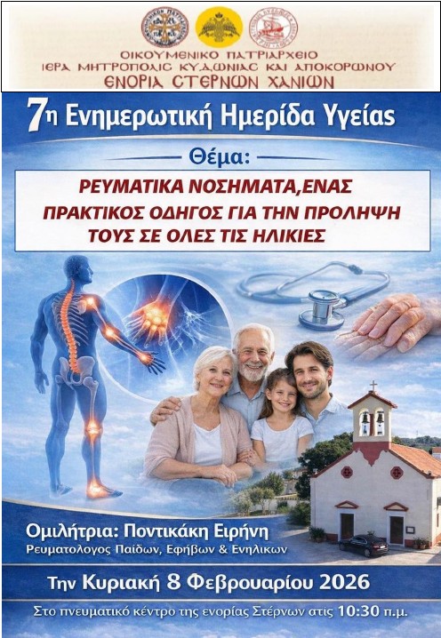 Η Ενορία Στερνών, στο πλαίσιο της συνεχούς προσπάθειάς της για ενημέρωση, πρόληψη και προαγωγή της υγείας, συνεχίζει με συνέπεια τη διοργάνωση ενημερωτικών ημερίδων υγείας για το ευρύ κοινό. Στο πλαίσιο αυτό, διοργανώνει την 7η Ενημερωτική Ημερίδα Υγείας, η οποία θα πραγματοποιηθεί την Κυριακή 8 Φεβρουαρίου 2026 και ώρα 10:30 π.μ., στο Πνευματικό Κέντρο της Ενορίας Στερνών.