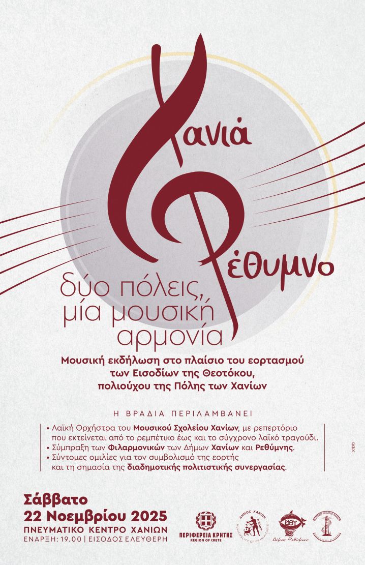 Η Περιφέρεια Κρήτης – Περιφερειακή Ενότητα Χανίων, σε συνδιοργάνωση με το Δήμο Χανίων, το Δήμο Ρεθύμνου και το Μουσικό Σχολείο Χανίων, στο πλαίσιο του εορτασμού των Εισοδίων της Θεοτόκου – πολιούχου των Χανίων, διοργανώνει μια ξεχωριστή μουσική και πολιτιστική εκδήλωση με τίτλο:
