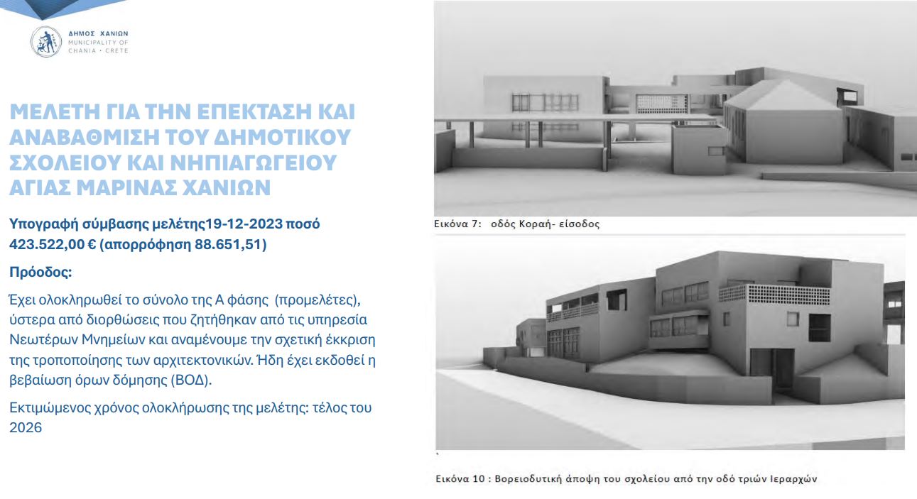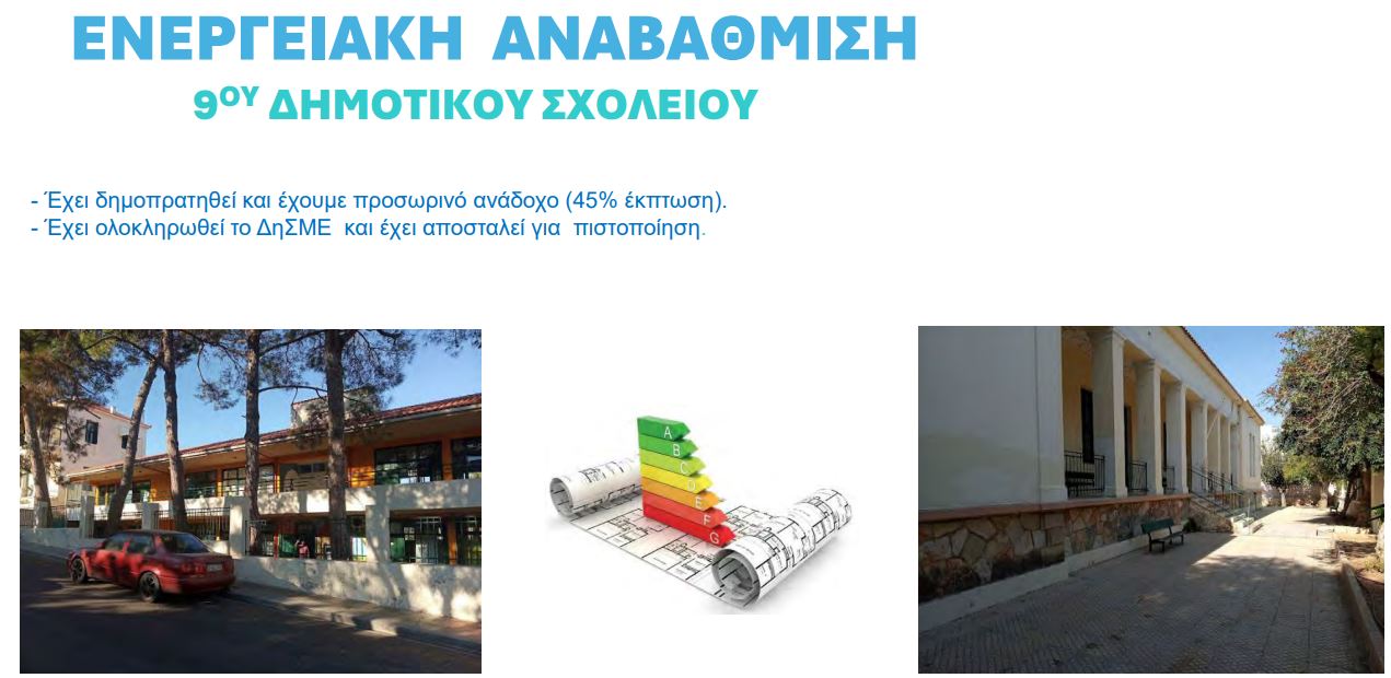 Τέλος, υπάρχουν μικρότερα έργα, όπως η ενεργειακή αναβάθμιση του 9ου Δημοτικού Σχολείου που έχει δημοπρατηθεί, ενώ η επέκταση του δημοτικού και νηπιαγωγείου Αγίας Μαρίνας βρίσκεται ακόμα στο στάδιο της μελέτης.