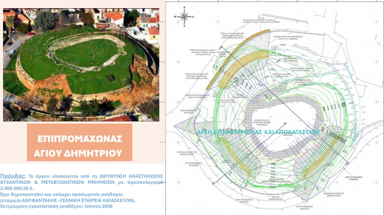 Για τον επιπρομαχώνα Αγίου Δημητρίου που έχει καταρρεύσει δύο φορές και έχει γίνει προσωρινή αντιστήριξη των τειχών του, επίσης έχει δημοπρατηθεί η οριστική αποκατάσταση και το καλοκαίρι αναμένεται να εγκατασταθεί ο εργολάβος.