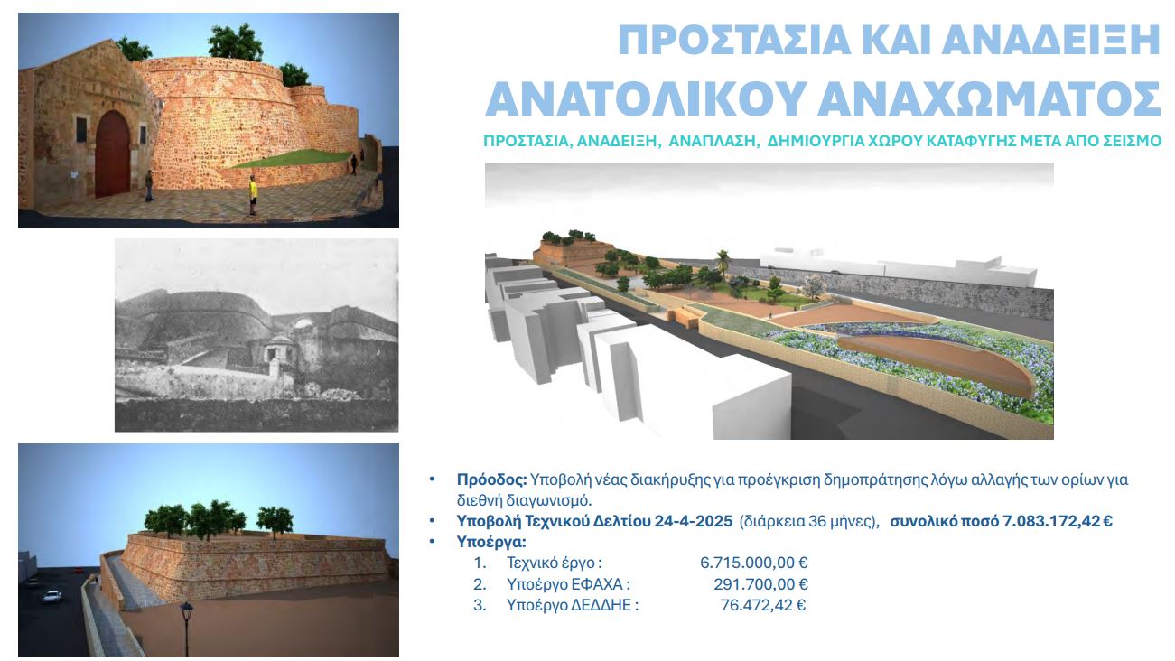 Ανάμεσα στα έργα που περιλαμβάνονται είναι η ανάπλαση του κάτω Κουμ Καπί, η μετατροπή της οδού Τζανακάκη σε ήπιας κυκλοφορίας, οι επισκευές στις ενετικές οχυρώσεις όπως ο επιπρομαχώνας Αγίου Δημητρίου, η ανάπλαση της Ανατολικής Τάφρου, των Ταμπακαριών και άλλα.