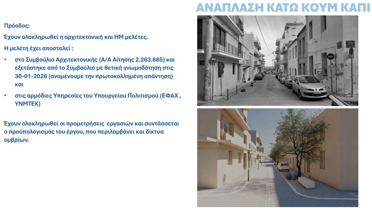 Για την ανάπλαση του Κάτω Κουμ Καπί (όχι του παραλιακού μετώπου) που περιλαμβάνει και τον χώρο γύρω από τη βίλα Κούνδουρου, αναμένονται ακόμα εγκρίσεις από το υπουργείο Πολιτισμού αλλά εκφράστηκε αισιοδοξία ότι θα υποβληθεί αίτηση χρηματοδότησης τον Μάρτιο και αν συμβεί αυτό, θα μπορεί εντός του τρέχοντος έτους να γίνει δημοπράτηση του έργου.