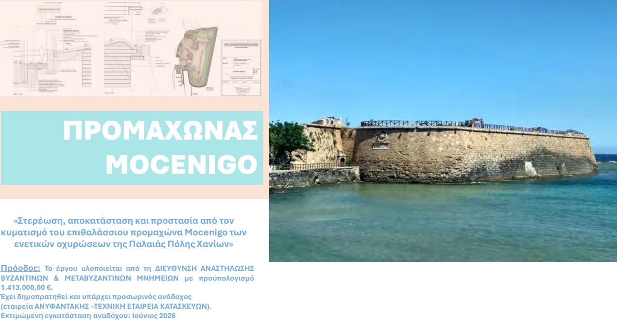 Για την αποκατάσταση του προμαχώνα Μοτσενίγκο, την οποία έχει αναλάβει η αρχαιολογία, έχει γίνει η δημοπράτηση και αναμένεται το καλοκαίρι να εγκατασταθεί ο ανάδοχος. Το έργο περιλαμβάνει επισκευή των οπών που έχουν ανοίξει στο τοίχωμα, καθαρισμό και άλλες εργασίες.