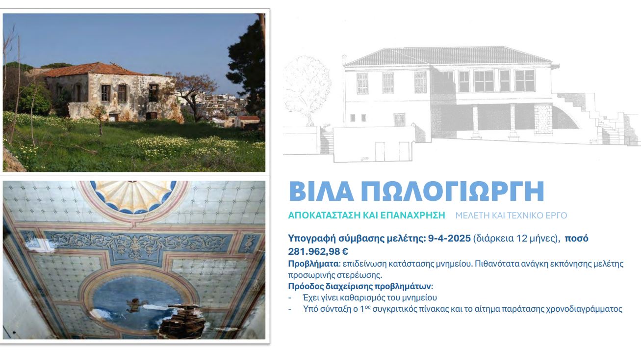 Για την αποκατάσταση της βίλας Σβαρτς και της βίλας Πολογιώργη, οι μελέτες στην καλύτερη περίπτωση θα είναι έτοιμες στο τέλος του 2026 και ενδεχομένως το 2027 να φτάσουμε σε στάδιο δημοπράτησης. Στη βίλα Σβαρτς υπάρχει και πρόβλημα στατικότητας του κτιρίου.