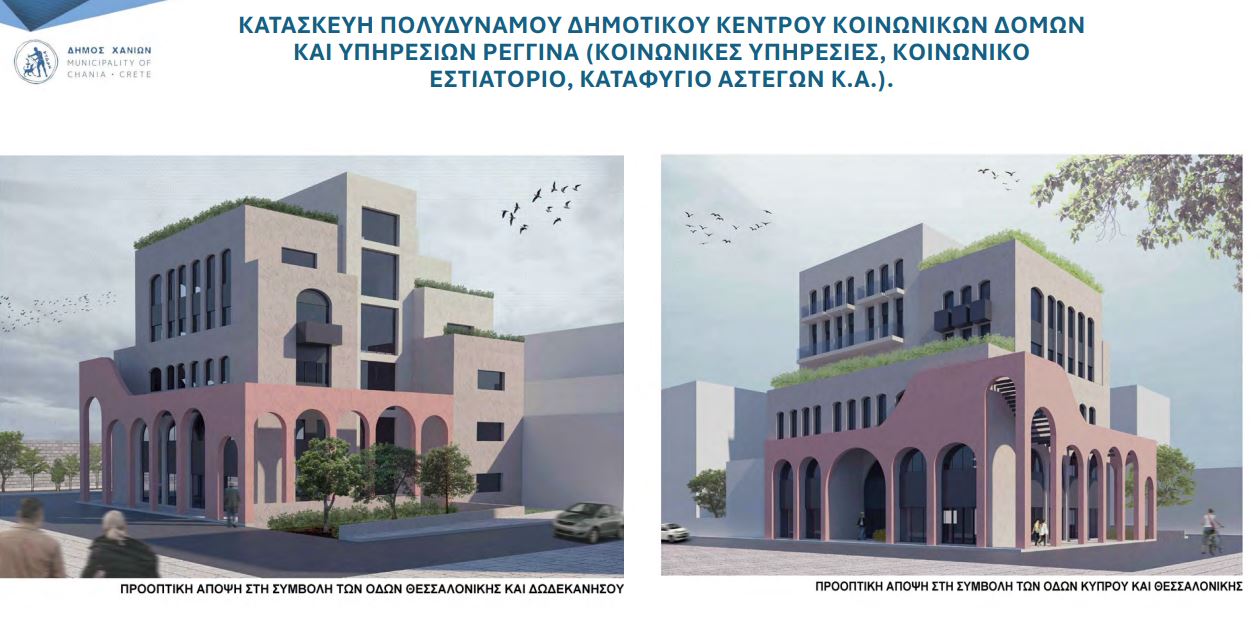 Μεγάλη καθυστέρηση έχει παρατηρηθεί στο έργο του κοινωνικού κέντρου του δήμου Χανίων στη Ρεγγίνα. Εκεί ουσιαστικά χρειάστηκε να ξαναγίνει σχεδόν από την αρχή η μελέτη λόγω αλλαγής του οικοδομικού κανονισμού πανελλαδικά που είχε προκύψει λόγω της ακύρωσης προβλέψεων του ΝΟΚ από το ΣτΕ. Το κτίριο τώρα θα είναι χαμηλότερο κατά έναν όροφο, αλλά προστίθεται υπόγειο. Η μελέτη αναμένεται να είναι έτοιμη ως το τέλος του έτους, πράγμα που σημαίνει ότι η δημοπράτηση θα γίνει το 2027, εκτός απροόπτου.