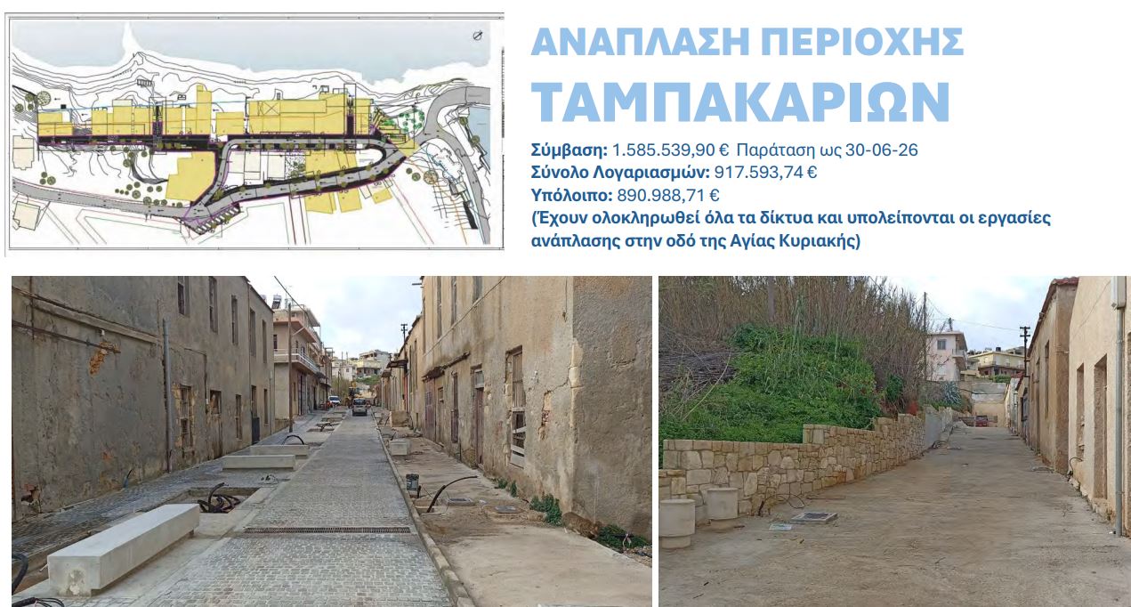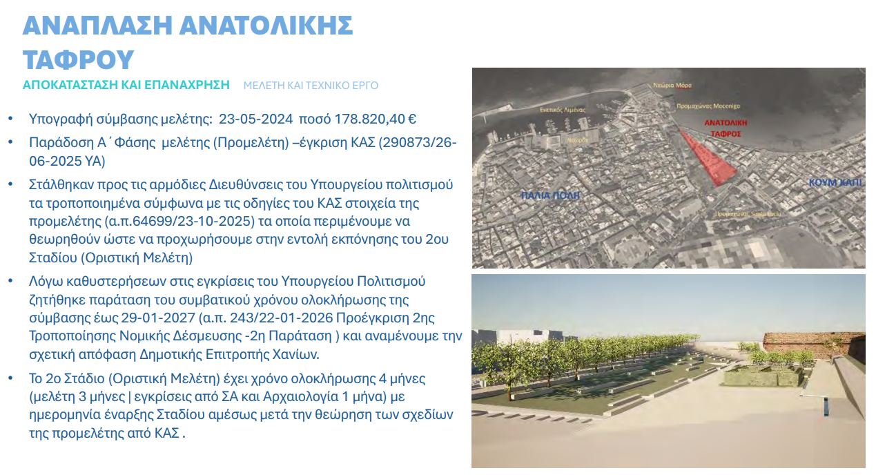 Ο δήμαρχος Χανίων δήλωσε ότι όλα τα έργα του ΒΑΑ αναμένεται να έχουν ενταχθεί σε χρηματοδότηση και κάποια θα έχουν δημοπρατηθεί ως το τέλος του 2026. Ενδιαφέρον όμως παρουσιάζει η εξέλιξη για δύο έργα που δεν αποτελούσαν αντικείμενο της σύσκεψης και συγκεκριμένα η ανάπλαση του παραλιακού μετώπου του Κουμ Καπί και αποκατάσταση στο Ενετικό Λιμάνι που περιλαμβάνει και τα σκιάδια: