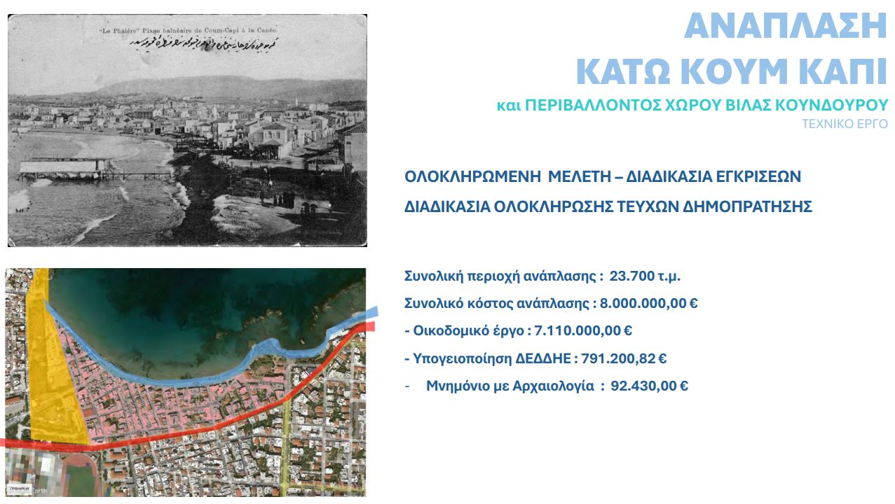 Για την ανάπλαση του Κάτω Κουμ Καπί (όχι του παραλιακού μετώπου) που περιλαμβάνει και τον χώρο γύρω από τη βίλα Κούνδουρου, αναμένονται ακόμα εγκρίσεις από το υπουργείο Πολιτισμού αλλά εκφράστηκε αισιοδοξία ότι θα υποβληθεί αίτηση χρηματοδότησης τον Μάρτιο και αν συμβεί αυτό, θα μπορεί εντός του τρέχοντος έτους να γίνει δημοπράτηση του έργου.