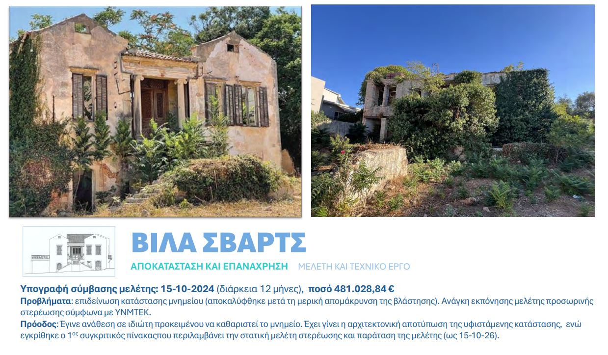 Για την αποκατάσταση της βίλας Σβαρτς και της βίλας Πολογιώργη, οι μελέτες στην καλύτερη περίπτωση θα είναι έτοιμες στο τέλος του 2026 και ενδεχομένως το 2027 να φτάσουμε σε στάδιο δημοπράτησης. Στη βίλα Σβαρτς υπάρχει και πρόβλημα στατικότητας του κτιρίου.