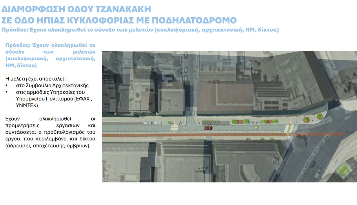 Για τη μετατροπή της οδού Τζανακάκη σε ήπιας κυκλοφορίας (κάτι αντίστοιχο με αυτό που έχει γίνει στο Open Mall, τις οδούς Μυλωνογιάννη, Κριάρη κλπ) εκφράστηκε η ελπίδα να έχουν ολοκληρωθεί όλες οι αδειοδοτήσεις ως τις αρχές καλοκαιριού και να αποσταλεί η αίτηση χρηματοδότησης από το ΒΑΑ τον Ιούνιο.