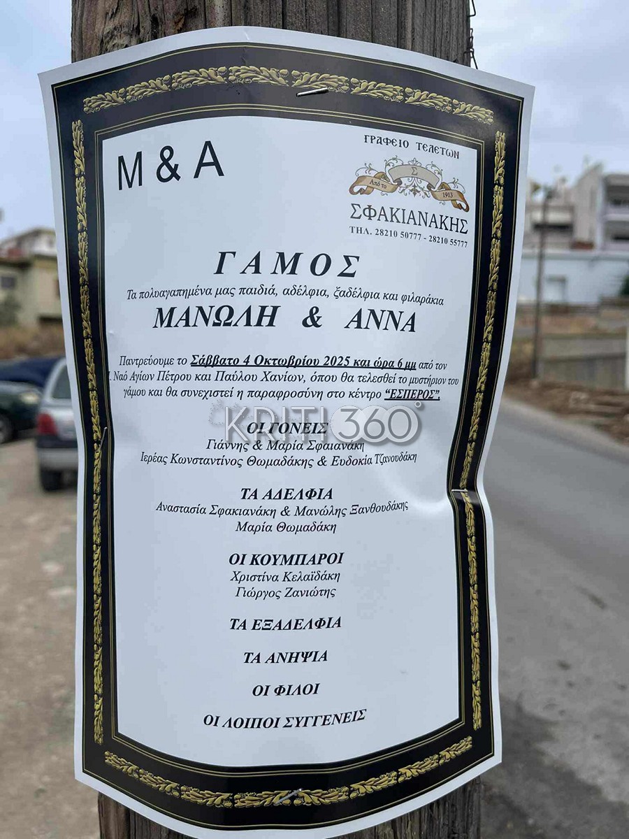 Φυσικά δεν το έκανε για κάποιον πελάτη, καθώς γαμπρός είναι ο γιος του ιδιοκτήτη του γραφείου τελετών, Γιάννη Σφακιανάκη, Μανώλης, ο οποίος παντρεύεται την εκλεκτή της καρδιάς του, Άννα.