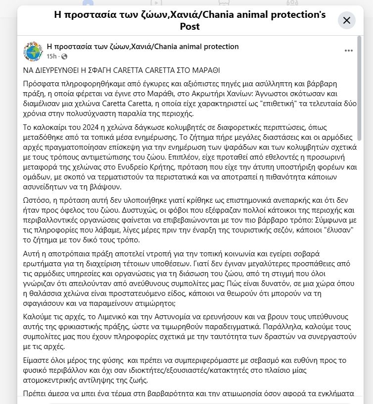 Σε ανάρτηση στα μέσα κοινωνικής δικτύωσης αναφέρει χαρακτηριστικά ότι “Άγνωστοι σκότωσαν και διαμέλισαν μια χελώνα Caretta Caretta, η οποία είχε χαρακτηριστεί ως “επιθετική” τα τελευταία δύο χρόνια στην πολυσύχναστη παραλία της περιοχής. Σύμφωνα με τις πληροφορίες που λάβαμε, λίγες μέρες πριν την έναρξη της τουριστικής σεζόν, κάποιοι “έλυσαν” το ζήτημα με τον δικό τους τρόπο”.