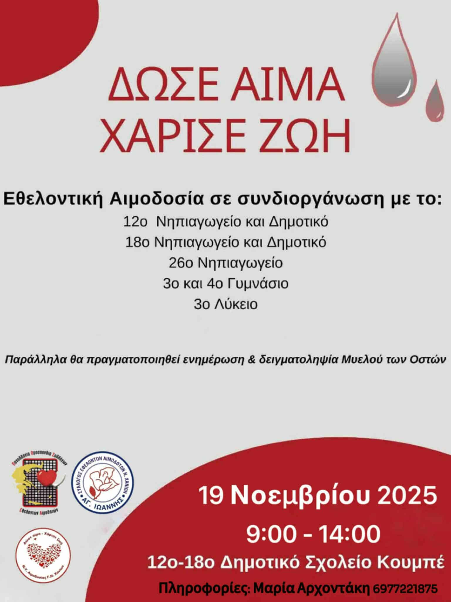Στις 19 Νοεμβρίου, μαθητές και κάτοικοι θα συμμετάσχουν σε δράση ζωής με αιμοδοσία και δειγματοληψία μυελού των οστών στα Σχολεία Κουμπέ, σε συνεργασία με νηπιαγωγεία και γυμνάσια της περιοχής.