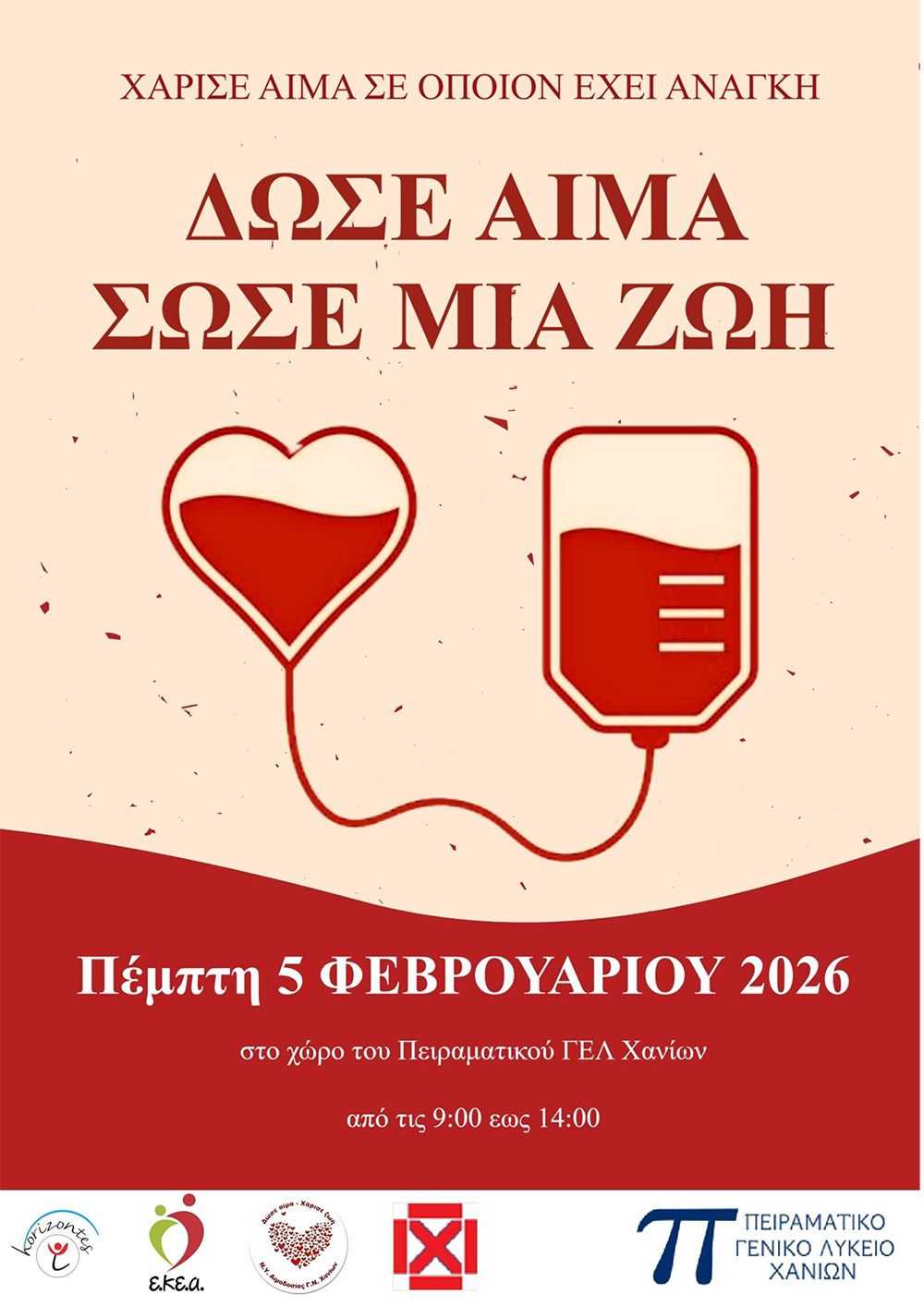 Το Πειραματικό Γενικό Λύκειο Χανίων σε συνεργασία με το Τμήμα Αιμοδοσίας του Γενικού Νοσοκομείου Χανίων «Άγιος Γεώργιος», τον Εκπαιδευτικό Οργανισμό «Ορίζοντες» και τον Εθνικό Κέντρο Αιμοδοσίας, διοργανώνει εθελοντική αιμοδοσία στον χώρο του σχολείου.