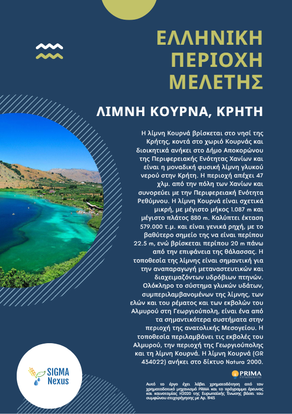 Η λίμνη του Κουρνά στον Αποκόρωνα Χανίων, είναι η μόνη περιοχή της Κρήτης, η οποία βρέθηκε στο επίκεντρο του Προγράμματος Βιώσιμης Καινοτομίας και Διακυβέρνησης στην περιοχή της Μεσογείου για το Πλέγμα σχέσεων Υδάτων, Οικοσυστημάτων, Τροφίμων και Ενέργειας – (Sustainable Innovation and Governance in the Mediterranean Area for the Water, Energy, Food Nexus) – SIGMA Nexus.