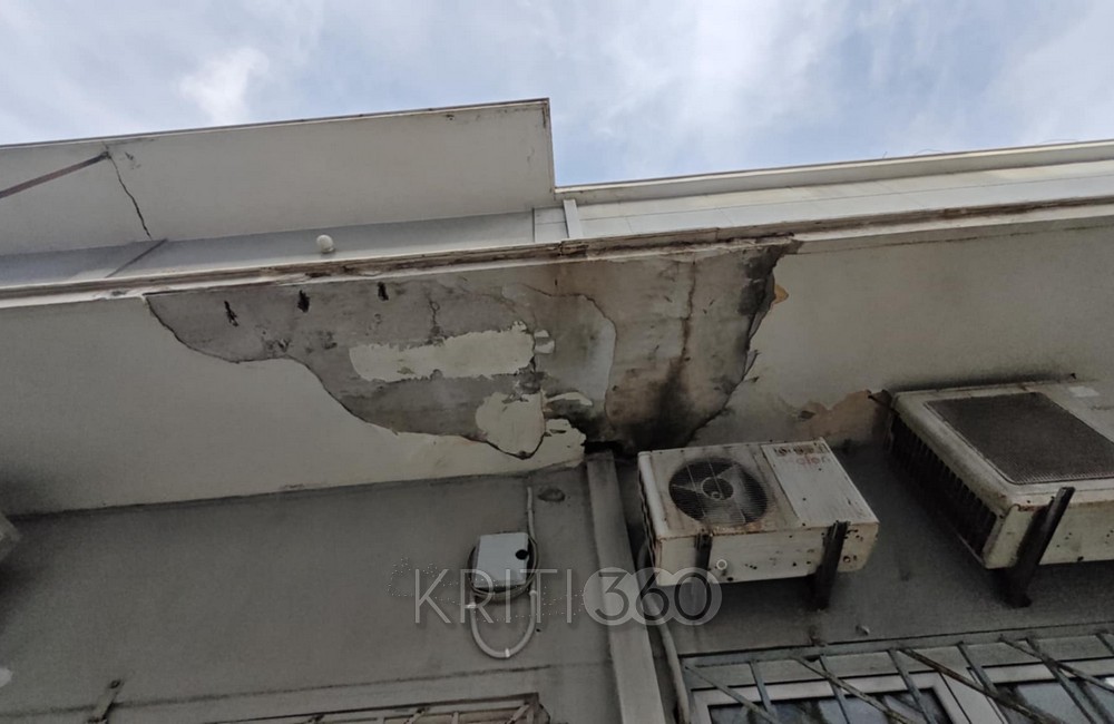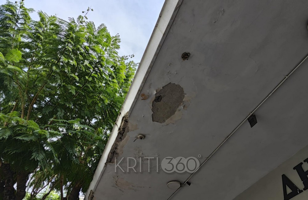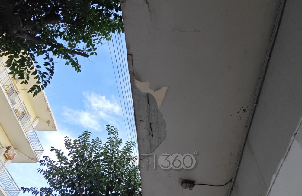 Τα αποκολλημένα τμήματα μπετόν από τα διαβρωμένα πρεβάζια τόσο της εισόδου του κτιρίου αλλά και σε πολλά ακόμα σημεία θυμίζουν την εικόνα πολυκατοικιών που τόσο συχνά καταγράφουν οι πολίτες στα παράπονά τους, υπενθυμίζοντας ότι η ασφάλεια δεν είναι θέμα τύχης.
