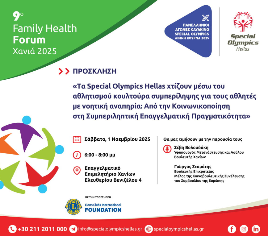 Παράλληλα, το Σάββατο 1 Νοεμβρίου στις 18:00 – 20:00, στο πλαίσιο του Προγράμματος Οικογενειών, διοργανώνεται το 9ο Family Health Forum, μία ετήσια δράση αφιερωμένη στην ενημέρωση των ​ οικογενειών των αθλητών και αθλητριών με νοητική αναπηρία. Το Forum θα διεξαχθεί στο Επαγγελματικό Επιμελητήριο Χανίων, με θέμα «Τα Special Olympics Hellas χτίζουν μέσω του αθλητισμού κουλτούρα συμπερίληψης για τους αθλητές με νοητική αναπηρία: Από την Κοινωνικοποίηση στη Συμπεριληπτική Επαγγελματική Πραγματικότητα». Το 9ο Family Forum ​ απευθύνεται σε όλα τα μέλη του Προγράμματος Οικογενειών αθλητών και αθλητριών, οικογένειες ατόμων με νοητική αναπηρία, εκπαιδευτικούς, θεσμικούς, κοινωνικούς και επαγγελματικούς φορείς που επιθυμούν να προάγουν την ισότιμη συμμετοχή των αθλητών και αθλητριών μας στην επαγγελματική και κοινωνική πραγματικότητα.