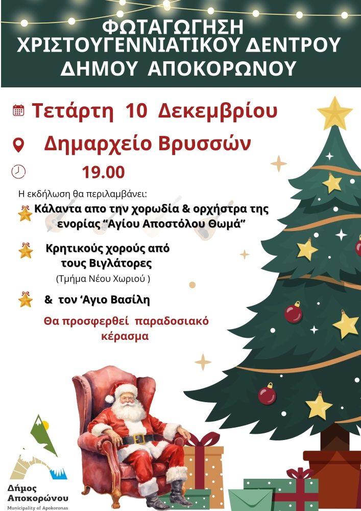 Ο Δήμος Αποκορώνου σας προσκαλεί να ζήσετε μαζί τη μαγεία των Χριστουγέννων στην εορταστική εκδήλωση για τη φωταγώγηση του Χριστουγεννιάτικου Δέντρου. Η εκδήλωση θα πραγματοποιηθεί την Τετάρτη 10 Δεκεμβρίου στις 19:00 στο Δημαρχείο Βρυσών και υπόσχεται να γεμίσει τον ουρανό του Αποκόρωνα με φως, χαμόγελα και ελπίδα για ένα καλύτερο αύριο.