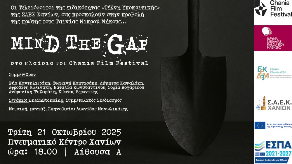 Οι τελειόφοιτοι Υποκριτικής της ΣΑΕΚ Χανίων, προβάλουν την Πρώτη τους Ταινία Μικρού Μήκους “MIND THE GAP”, στο πλαίσιο του 13ου Φεστιβάλ Κινηματογράφου Χανίων | Chania Film Festival, την Τρίτη 21 Οκτωβρίου 2025, ώρα 18.00,στο Πνευματικό Κέντρο Χανίων – Αίθουσα Α’
