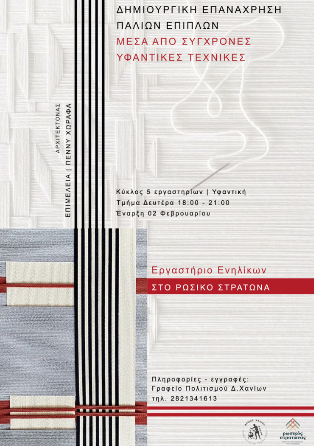 Ένα ξεχωριστό εργαστήριο για ενήλικες με θέμα: «Δημιουργική επανάχρηση παλιών επίπλων μέσα από σύγχρονες υφαντικές τεχνικές» θα πραγματοποιηθεί τις επόμενες εβδομάδες στον Ρωσικό Στρατώνα του Δήμου Χανίων.