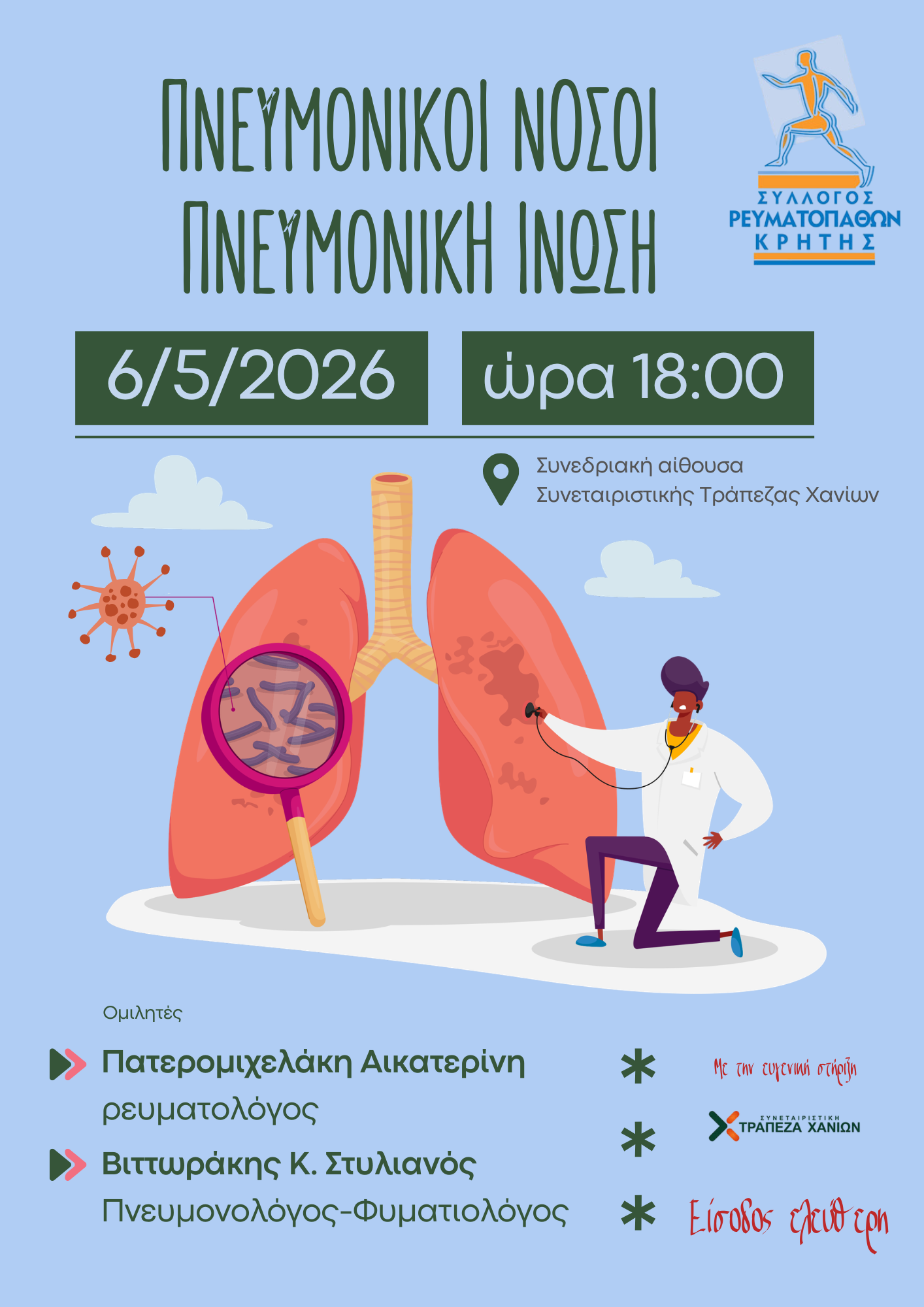 Ενημερωτική εκδήλωση στη συνεδριακή αίθουσα της Συνεταιριστικής Τράπεζας Χανίων την Τετάρτη 6/5/2026 και ώρα 18:00, με τίτλο «Πνευμονικοί νόσοι – Πνευμονική Ίνωση», και ομιλητές την κα Αικατερίνη Πατερομιχελάκη, ρευματολόγο και τον κο Στυλιανό Βιττωράκη, Πνευμονολόγο-Φυματιολόγο, διοργανώνει ο Σύλλογος Ρευματοπαθών Κρήτης.