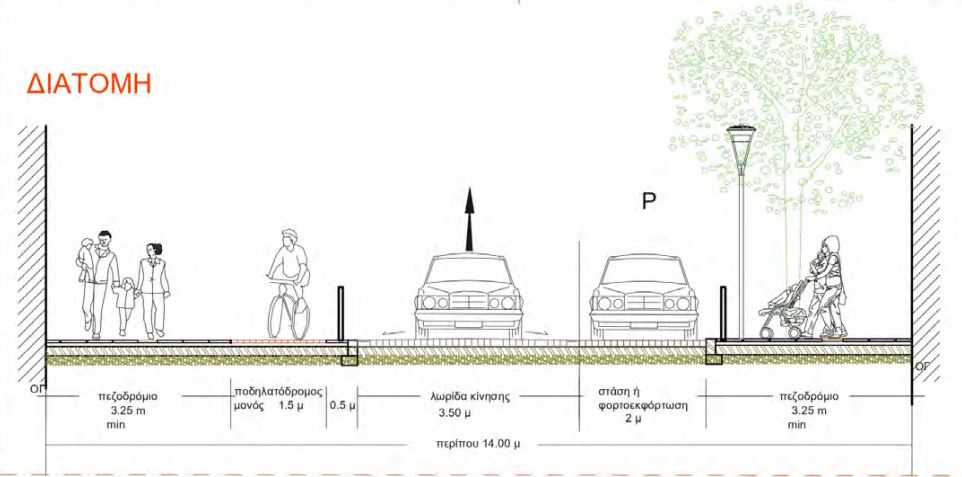 Τα πεζοδρόμια θα είναι πλάτους 3,25 μέτρων και θα υπάρχει ποδηλατόδρομος. Έτσι θα απομένει μόνο μία λωρίδα κυκλοφορίας για τα αυτοκίνητα.
