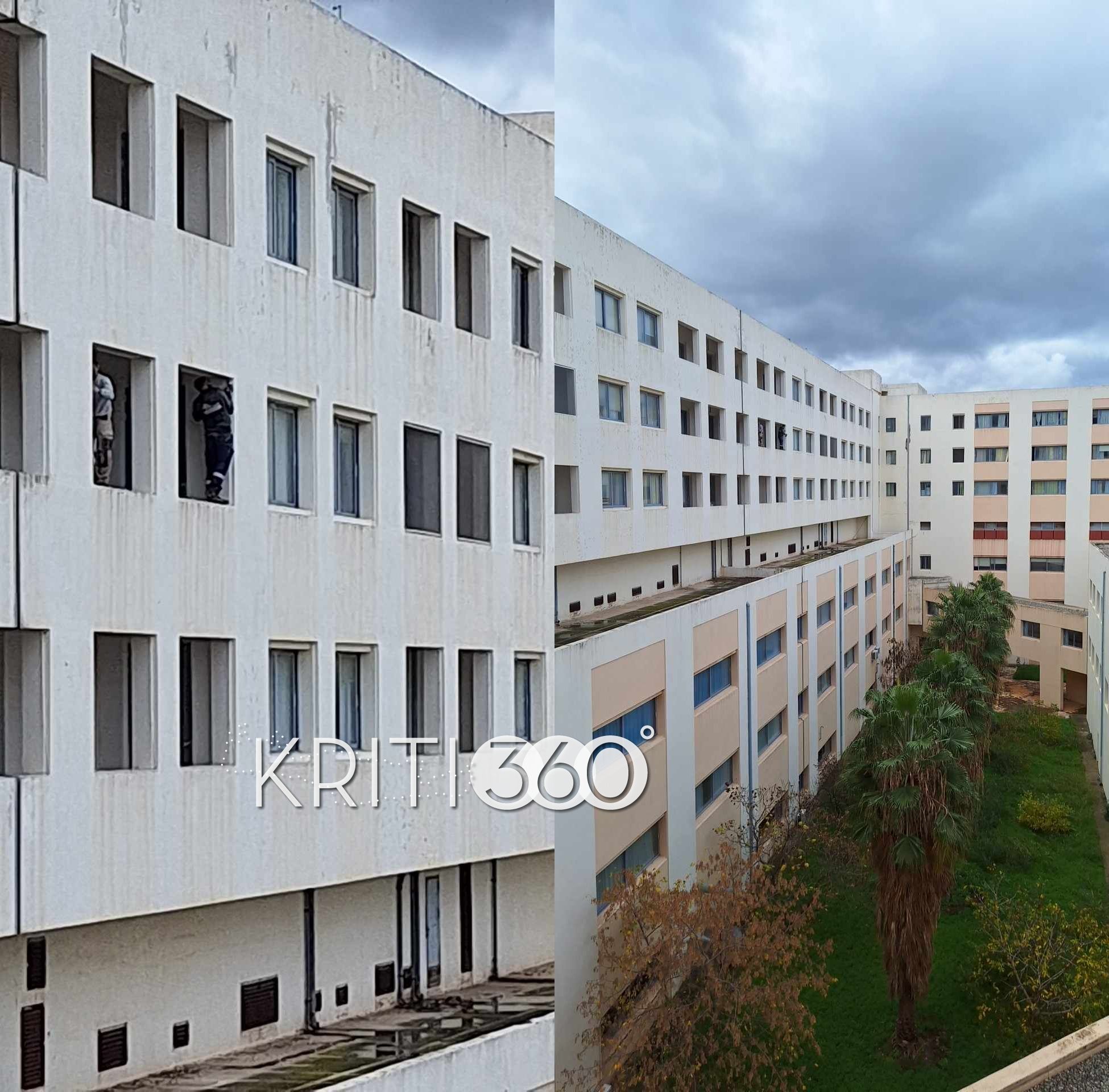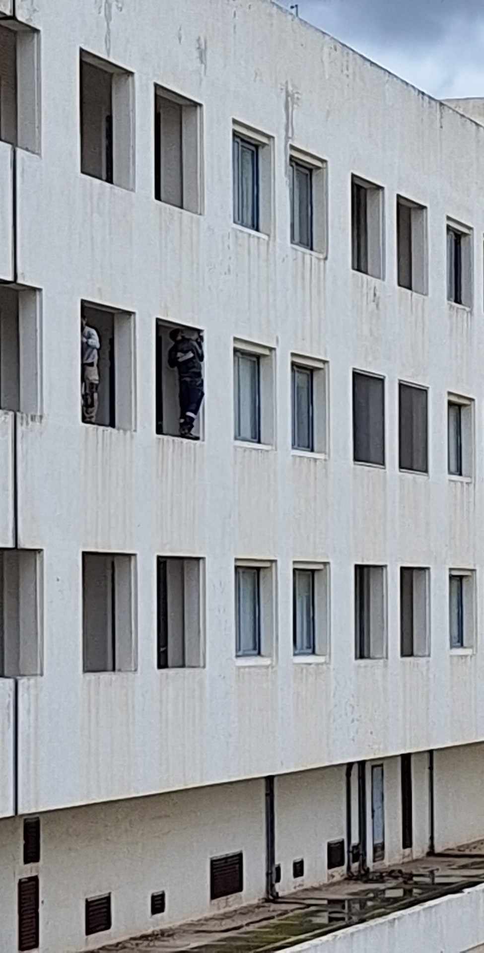 Μάλιστα, όπως μπορείτε να διαπιστώσετε στις φωτογραφίες και το βίντεο του kriti360.gr εθεάθησαν να εκτελούν εργασίες στον 4ο όροφο του ΓΝΧ ισορροπώντας στα πρεβάζια των παραθύρων, χωρίς όπως φαίνεται να έχουν πάρει κάποιο μέτρο ασφάλειας.