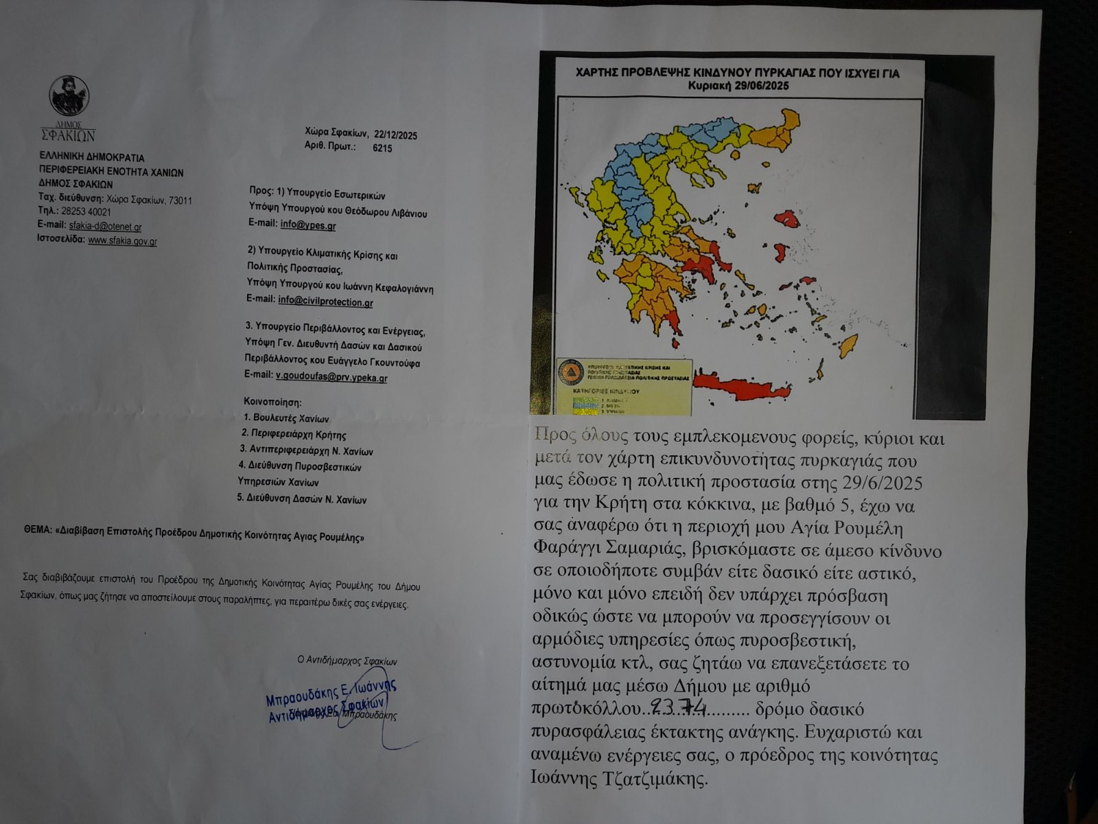 Ο κ. Τζατζιμάκης επανέφερε το ζήτημα δημιουργίας δασικού δρόμου που θα οδηγεί στην Αγία Ρουμέλη, ο οποίος θα μπορεί να χρησιμοποιείται σε σοβαρές καταστάσεις, όχι μόνο ιατρικής φύσεως αλλά και σε περιπτώσεις πυρκαγιάς ή αν χρειαστεί αστυνομική επέμβαση.