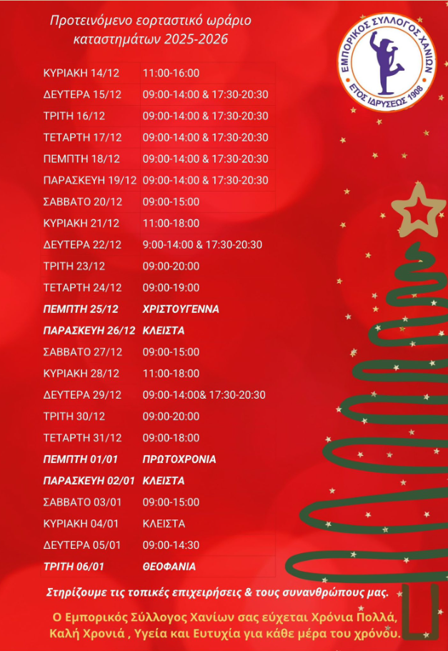 Ο Εμπορικός Σύλλογος Χανίων ανακοίνωσε το προτεινόμενο ωράριο λειτουργίας των εμπορικών καταστημάτων στα Χανιά για την εορταστική περίοδο των Χριστουγέννων 2025 έως και τα Θεοφάνια 2026.