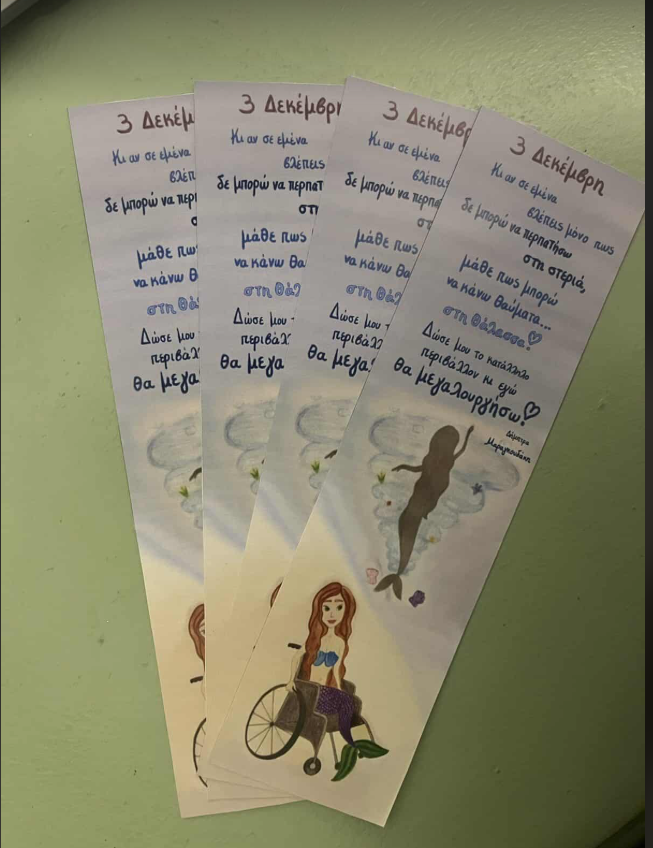 Στο τέλος, κάθε μαθητής έλαβε έναν αναμνηστικό σελιδοδείκτη. Η ζωγραφιά που φιλοξενείται στους σελιδοδείκτες είχε δημιουργηθεί από την εκπαιδευτικό του σχολείου μας, κ. Μαραγκουδάκη Δήμητρα, για έναν διαγωνισμό ζωγραφικής της Εταιρείας Προστασίας Σπαστικών, όπου διακρίθηκε και τυπώθηκε μαζί με άλλες δύο στα προϊόντα της εταιρείας. Με αυτόν τον τρόπο, οι μαθητές μας μαθαίνουν βιωματικά μέσα από τις πράξεις μας.