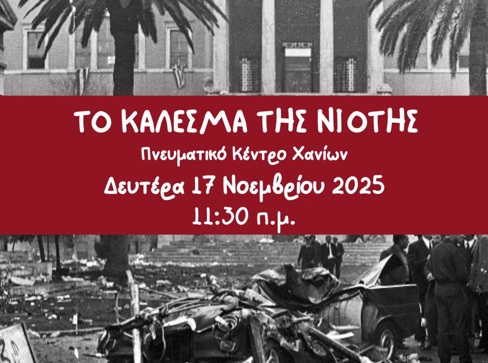 Με αφορμή την επέτειο του Πολυτεχνείου, το Πειραματικό Γυμνάσιο Χανίων, σε συνεργασία με την Περιφέρεια Κρήτης – Περιφερειακή Ενότητα Χανίων, διοργανώνει την καθιερωμένη Εκδήλωση Μνήμης με τίτλο «Το Κάλεσμα της Νιότης». Η εκδήλωση θα πραγματοποιηθεί τη Δευτέρα 17 Νοεμβρίου 2025, στις 11:30 π.μ., στο Πνευματικό Κέντρο Χανίων και η είσοδος θα είναι ελεύθερη για το κοινό.