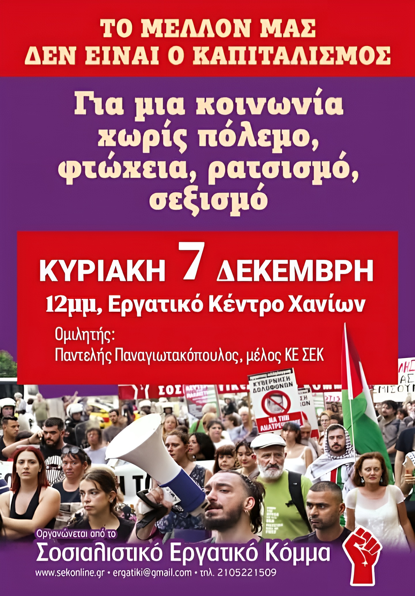 Εκδήλωση – συζήτηση οργανώνεται από το Σοσιαλιστικό Εργατικό Κόμμα ΣΕΚ Χανίων, με θέμα “Το μέλλον μας δεν είναι ο καπιταλισμός” την Κυριακή 7 Δεκεμβρίου, 12μμ στο Εργατικό Κέντρο Χανίων.