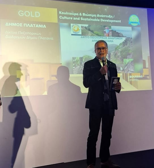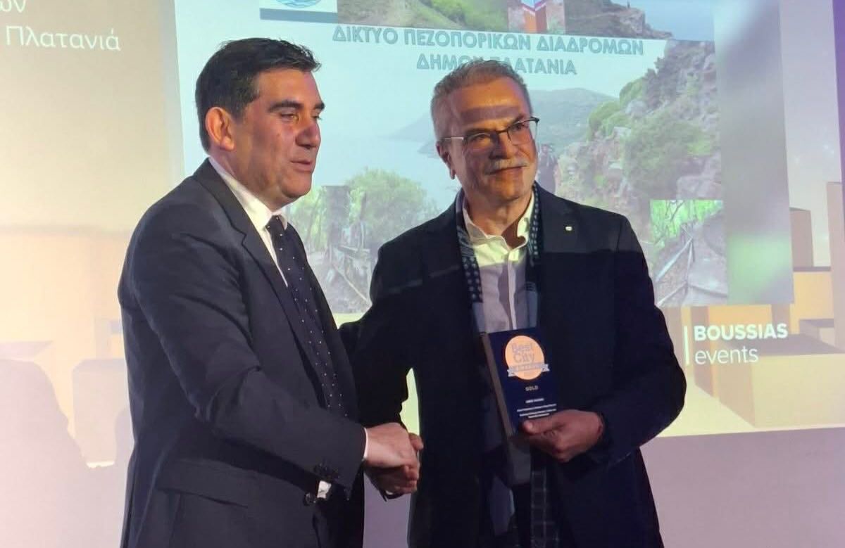 Με τη μοναδική του συμμετοχή και με Χρυσό Βραβείο «GOLD» για το «Δίκτυο Πεζοπορικών Διαδρομών Δήμου Πλατανιά» στη κατηγορία Κουλτούρα & Βιώσιμη Ανάπτυξη, διακρίθηκε ο Δήμος Πλατανιά στη φετινή απονομή των Best City Awards 2026, ενός θεσμού που επιβραβεύει καινοτόμες και έξυπνες πρακτικές στη λειτουργία των Δήμων, των Περιφερειών και λοιπών φορέων.