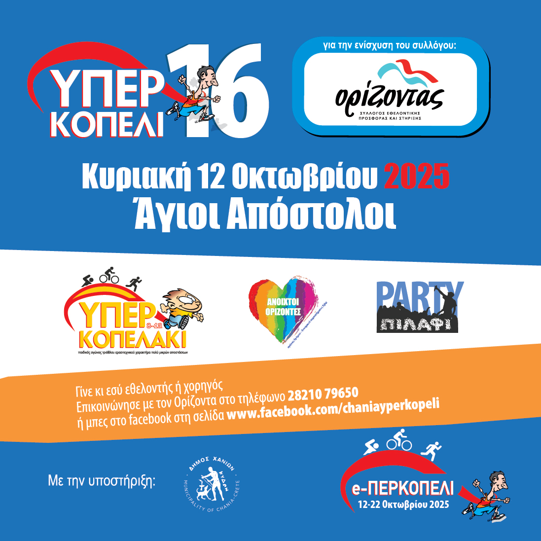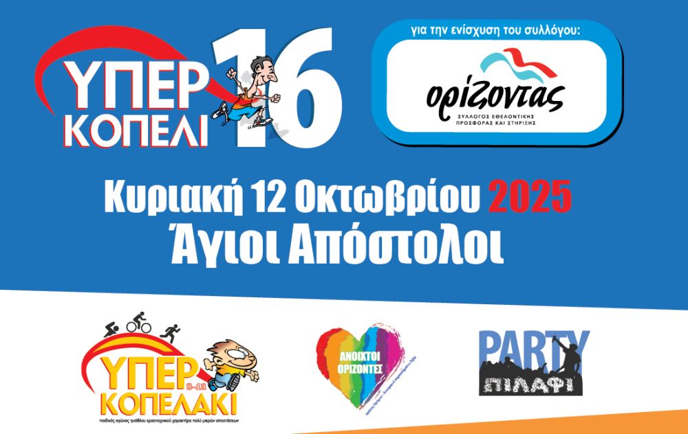 Την Κυριακή 12 Οκτωβρίου ξεκινάμε με τους αγαπημένους σε όλους μας πια αγώνες του Υπερκοπελιού: το «Υπερκοπελάκι» στις 11:00 και το «Υπερκοπέλι» στις 12:30, αγώνες τριάθλου ερασιτεχνικού χαρακτήρα για μικρούς και μεγάλους. Ένας αγώνας αλλιώτικος από τους άλλους, ένας «αγώνας για τη ζωή», με σκοπό τη συμμετοχή και όχι τη νίκη, χωρίς κατακτήριες θέσεις και επίσημη χρονομέτρηση. Το απόγευμα της ίδιας ημέρας στις 17:00, θα διεξαχθούν οι «Ανοιχτοί Ορίζοντες», ένας αγώνας δρόμου δυναμικού περπατήματος 5χλμ, χωρίς χρονομέτρηση και κατάταξη, στον οποίον οι συμμετέχοντες θα προσφέρουν το κόστος της συμμετοχής τους (5 ευρώ) σε όποιο σωματείο/ίδρυμα της πόλης μας επιθυμούν (θα ανακοινωθούν σύντομα).
