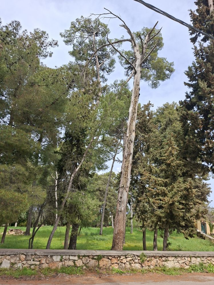 Το ξερό και επικίνδυνο αυτό πεύκοβρίσκεται στην άκρη του αλσυλλίου (εφάπτεται του τοιχίου περίφραξης) καιδίπλαακριβώς από τον δρόμο που καθημερινά τον διέρχονταιδεκάδεςμαθητές για να τους παραλάβουν τα σχολικά λεωφορεία.