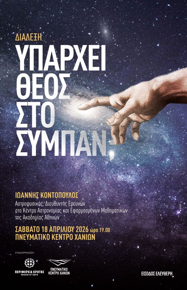 Το Πνευματικό Κέντρο Χανίων και η Περιφέρεια Κρήτης -Περιφερειακή Ενότητα Χανίων διοργανώνουν τη διάλεξη με θέμα: «Υπάρχει Θεός στο Σύμπαν;» του Αστροφυσικού, κ. Ιωάννη Κοντόπουλου, Διευθυντή Ερευνών στο Κέντρο Αστρονομίας και Εφαρμοσμένων Μαθηματικών της Ακαδημίας Αθηνών.