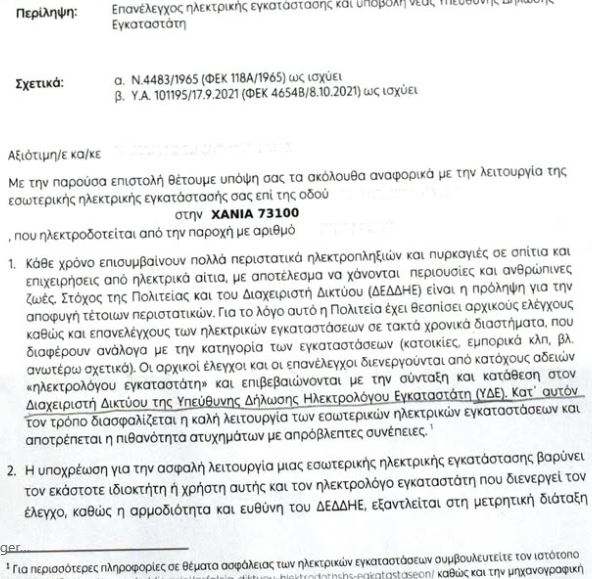 Με αφορμή τη διαμαρτυρία συμπολίτη μας, ο οποίος έλαβε έγγραφο από τον ΔΕΔΔΗΕ για τον υποχρεωτικό επανέλεγχο της ηλεκτρικής του εγκατάστασης και την υποβολή Υπεύθυνης Δήλωσης Εγκαταστάτη (ΥΔΕ), αναδεικνύεται ένα νέο βάρος στον οικογενειακό προϋπολογισμό – ένα ακόμα «χαράτσι», όπως χαρακτηριστικά το αποδίδει.