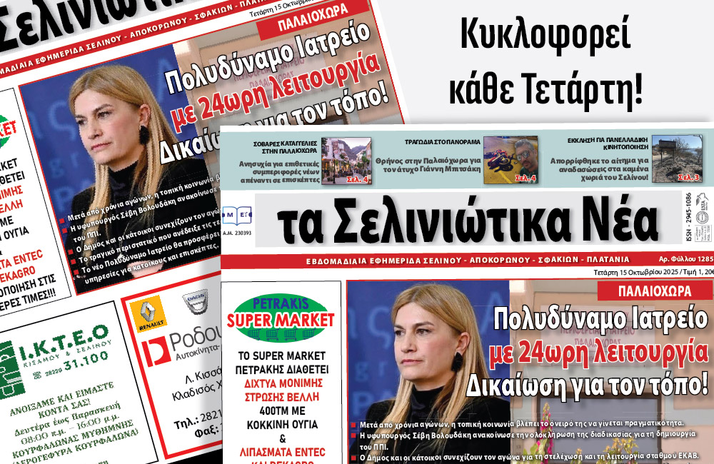 Διαβάστε σε τίτλους, τα βασικότερα από τα θέματα που φιλοξενούνται στο φύλλο των Σελινιώτικων Νέων, το οποίο κυκλοφορεί σήμερα Τετάρτη 8 Οκτωβρίου, 2025