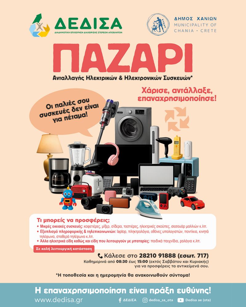 Η Διαδημοτική Επιχείρηση Διαχείρισης Στερεών Αποβλήτων [ΔΕΔΙΣΑ Α.Ε. (ΟΤΑ)] και ο Δήμος Χανίων, στο πλαίσιο της Ευρωπαϊκής Εβδομάδας Μείωσης Αποβλήτων (EWWR), διοργανώνουν Παζάρι «Ανταλλαγής» Ηλεκτρικών και Ηλεκτρονικών Συσκευών, με στόχο την προώθηση της επαναχρησιμοποίησης, τη μείωση των αποβλήτων και την ευαισθητοποίηση της κοινωνίας γύρω από την κυκλική οικονομία.