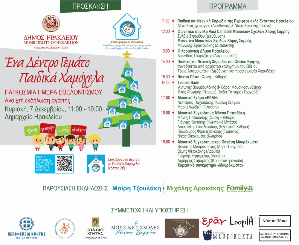 Ο Δήμος Ηρακλείου και η Αντιδημαρχία Εθελοντισμού με αφορμή την Παγκόσμια Ημέρα Εθελοντισμού, στις 5 Δεκεμβρίου, διοργανώνουν ανοικτή εκδήλωση αγάπης με τίτλο «Ένα Δέντρο Γεμάτο Παιδικά Χαμόγελα», την Κυριακή 7 Δεκεμβρίου, 11:00- 19:00 στη Λότζια.