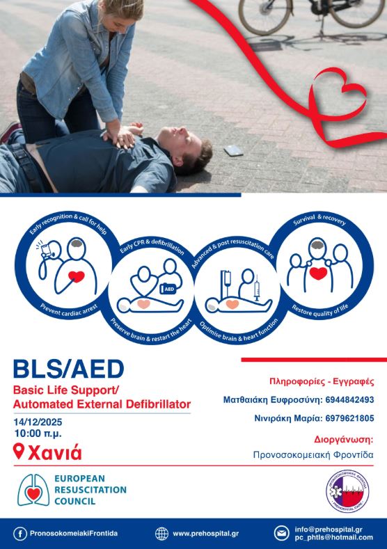 Την Κυριακή 14/12/2025 το Ευρωπαϊκό Κέντρο Αναζωογόνησης θα πραγματοποιήσει στα Χανιά σεμινάριο που απευθύνεται σε υγειονομικούς και βοηθητικό προσωπικό αλλά και σε κάθε ενδιαφερόμενο, με αντικείμενο την καρδιοπνευμονική αναζωογόνηση.