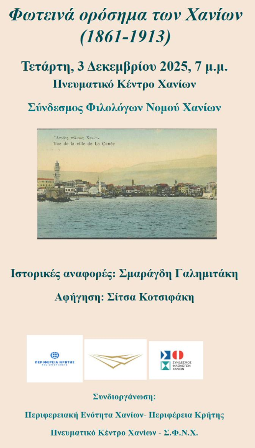 Ο Σύνδεσμος Φιλολόγων Νομού Χανίων (Σ.Φ.Ν.Χ.) σε συνδιοργάνωση με την Περιφέρεια Κρήτης-Περιφερειακή Ενότητα Χανίων και το Πνευματικό Κέντρο Χανίων πραγματοποιεί εκδήλωση την Τετάρτη, 3 Δεκεμβρίου 2025, ώρα 7 μ.μ. στο Πνευματικό Κέντρο με θέμα “Φωτεινά ορόσημα των Χανίων (1861-1913)”.