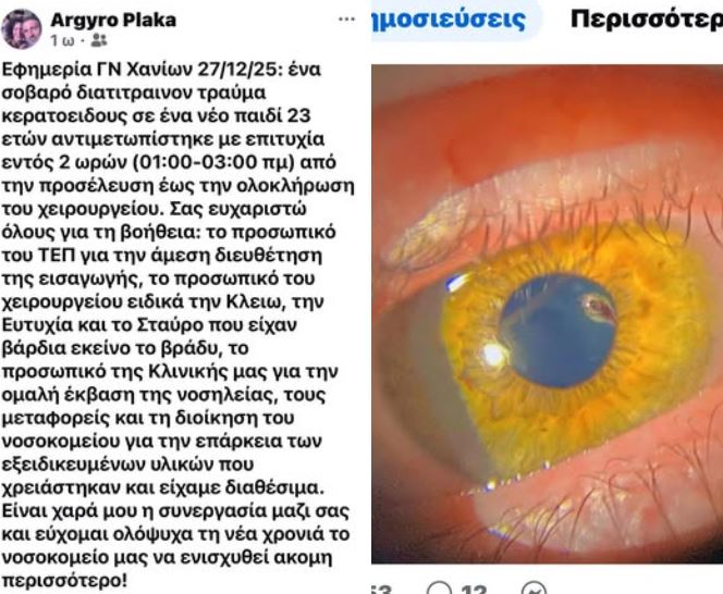 Όπως έκανε γνωστό σε ανάρτησή της η οφθαλμίατρος Αργυρώ Πλακά, ένας νεαρός μεταφέρθηκε στα ΤΕΠ με διάτρηση κερατοειδούς, μια κατάσταση που μπορεί να οδηγήσει σε τύφλωση.
