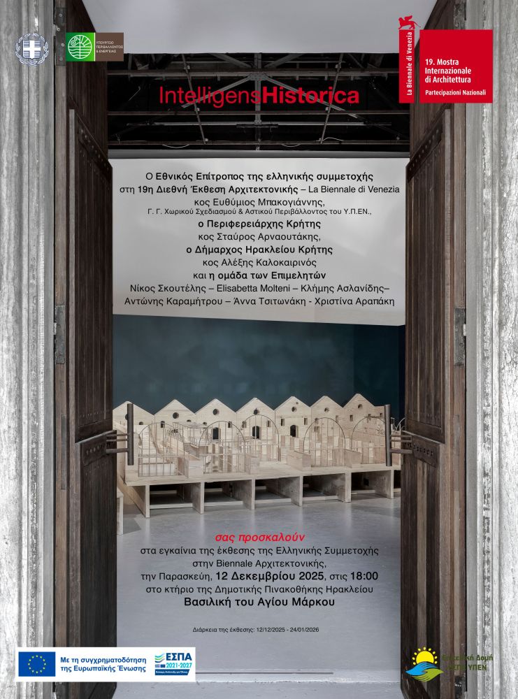 Η έκθεση αρχιτεκτονικής με τίτλο IntelligensHistorica παρουσιάζεται στην Δημοτική Πινακοθήκη Ηρακλείου, στην Βασιλική του Αγίου Μάρκου από τις 12 Δεκεμβρίου 2025 έως τις 23 Ιανουαρίου 2026