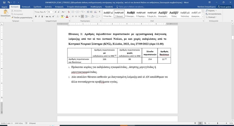 Από την αρχή της περιόδου 2022, μέχρι τις 27/09/2022 (ώρα 11:00), έχουν διαγνωστεί συνολικά διακόσια πενήντα τέσσερα (254) εγχώρια κρούσματα λοίμωξης από τον ιό του Δυτικού Νείλου στην Ελλάδα, εκ των οποίων τα 166 παρουσίασαν εκδηλώσεις από το Κεντρικό Νευρικό Σύστημα (ΚΝΣ, εγκεφαλίτιδα ή/και μηνιγγίτιδα ή/και οξεία χαλαρή παράλυση) και 88 είχαν ήπιες εκδηλώσεις (π.χ. εμπύρετο νόσημα)/ δεν είχε εκδηλώσεις από το ΚΝΣ (Πίνακας 1).