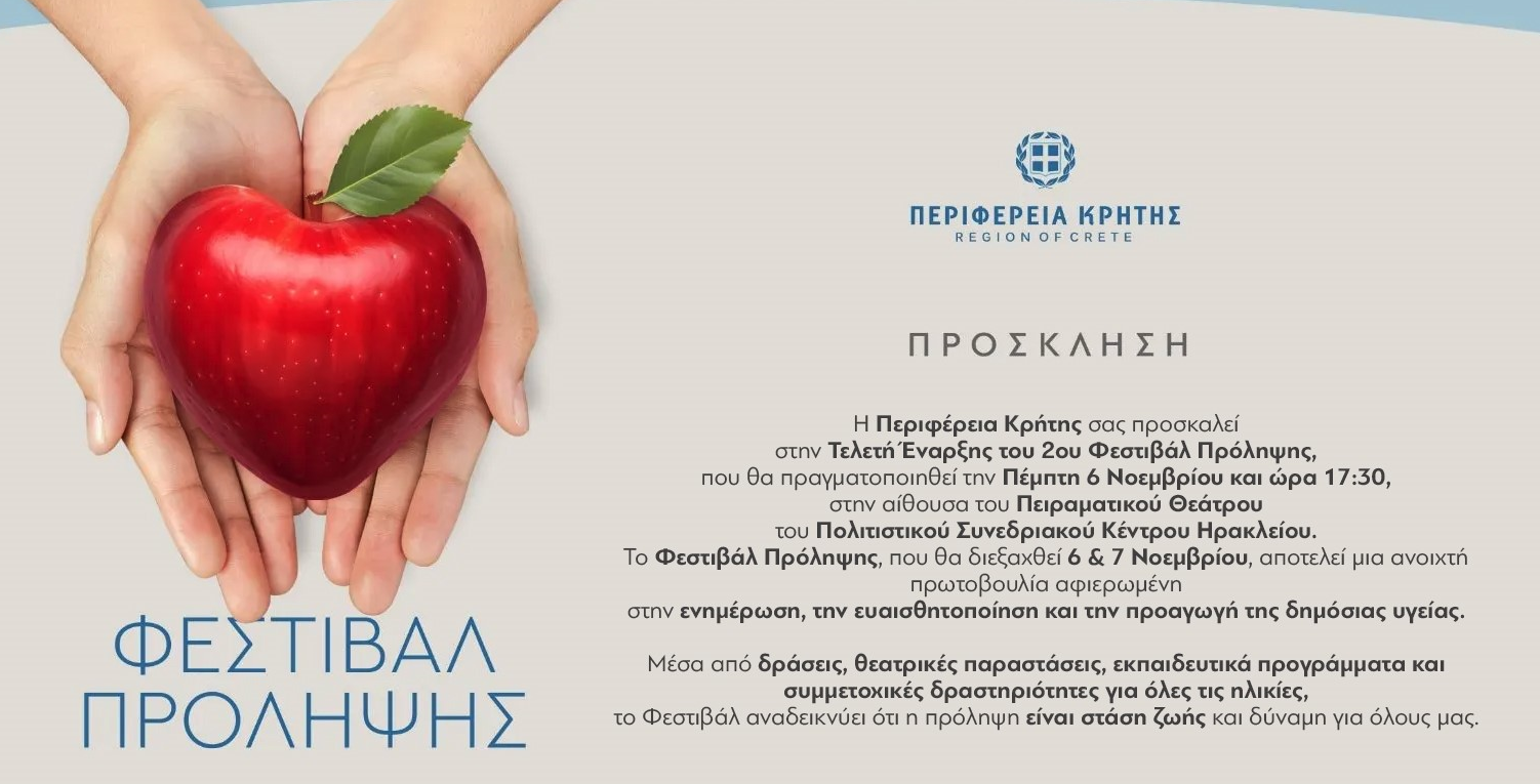 Η Περιφέρεια Κρήτης διοργανώνει για δεύτερη συνεχή χρονιά το Φεστιβάλ Πρόληψης, μια ανοιχτή δράση για όλους τους πολίτες, με ιδιαίτερη έμφαση στα παιδιά. Το φεστιβάλ πρόληψης θα πραγματοποιηθεί στις 6 και 7 Νοεμβρίου στο Πολιτιστικό και Συνεδριακό Κέντρο Ηρακλείου.