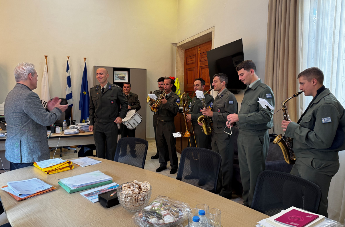 Λίγο αργότερα κατέφθασαν από τα Χανιά οι στρατιωτικοί μουσικοί της 44ης Στρατιωτικής Διοίκησης για να πουν τα χριστουγεννιάτικα κάλαντα στον Δήμαρχο Ηρακλείου ο οποίος τους ευχήθηκε υγεία, χαρά και ευημερία για την νέα χρονιά.